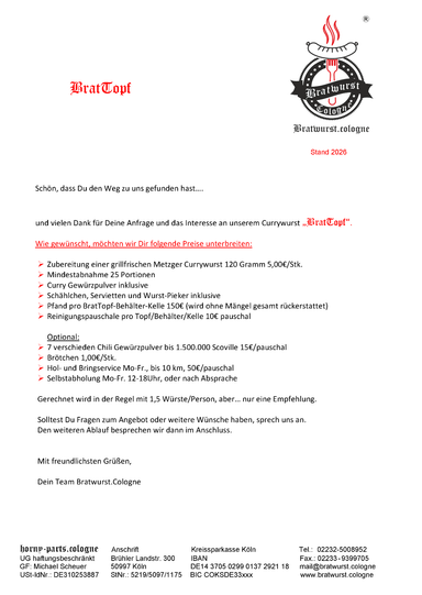 Sehr gerne machen wir Dir ab 25 Portionen unsere Currywurst auch in unserem "BratTopf" fertig. Wir grillen dir alles fertig und Du kommst unsere Currywurst inklusive einem beheizbaren Brattopf, Kelle, Currypulver und Gewürze abholen. Bei Bedarf können wir dir auch anliefern. Schälchen Servietten und Pieker liefern wir dir mit. So kannst du deine Gäste mit einer Originalen Currywurst überraschen.